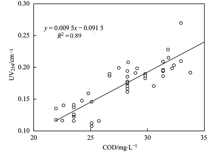 有研究表明, UV254與COD有一定的相關(guān)性, UV254值越小, 可生化性就越強(qiáng), 水中復(fù)雜有機(jī)物分解及去除效果就越好.對(duì)本實(shí)驗(yàn)數(shù)據(jù)進(jìn)行COD與UV254之間離散關(guān)系分析如圖 3所示, 并得出相關(guān)系數(shù)為0.89, 說(shuō)明COD與UV254之間具有強(qiáng)相關(guān)性.