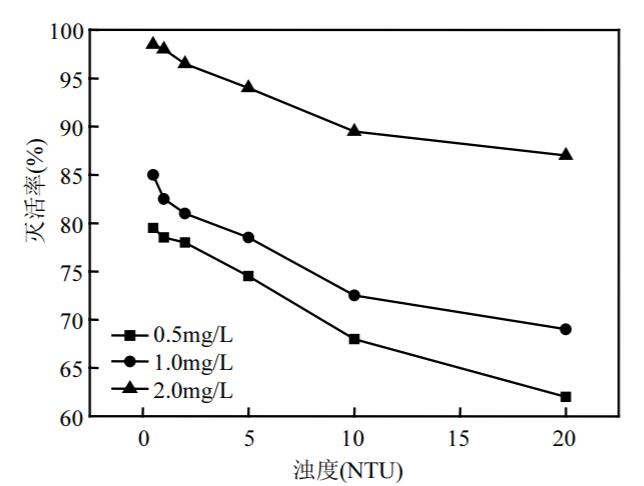3.當臭氧為 2.0mg/L 以上作用時間,在飲用水消毒的濁度、溫度、pH 值、初始藻細胞密度濃度范圍內(nèi),銅綠微囊藻的滅活率在 98.0%以上.
