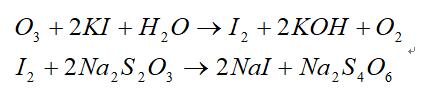 方法原理:一般采用化學(xué)碘量法。利用臭氧與碘化鉀的氧化還原反應(yīng),置換出與臭氧等當(dāng)量的碘。再用硫代硫酸鈉與碘作用,以淀粉為指示劑,待完全反應(yīng)生成無色碘化鈉。根據(jù)硫代硫酸鈉的消耗量計(jì)算出臭氧濃度。其化學(xué)反應(yīng)方程式如下:
