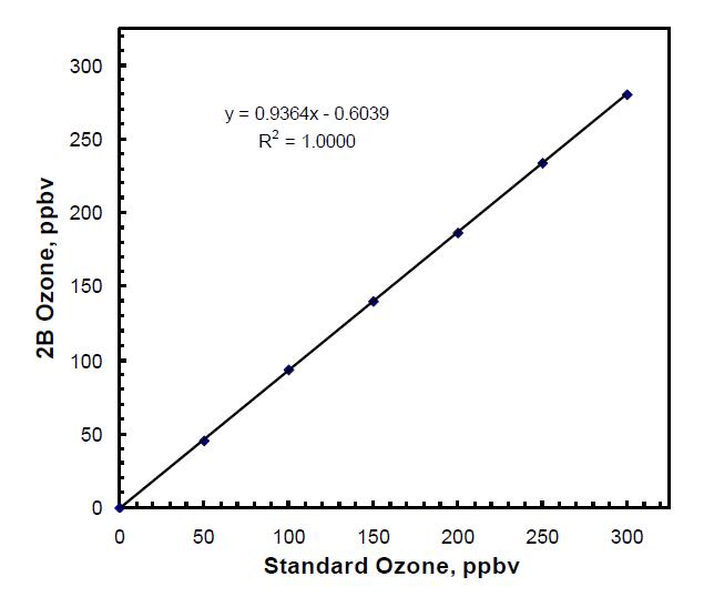 4. 通過將臭氧校準源或其他臭氧校準器設置為該濃度,測量至少一種臭氧濃度的輸出。如果您只使用一種濃度來確定跨度,我們建議使用 300 ppb。在 2B Technologies,我們使用 50、100、150、200、250 和 300 ppb 的標稱值。然而,2B Tech 臭氧監測儀具有極高的線性度,因此一個濃度就足夠了。對于每個濃度,應等到濃度測量穩定,然后平均至少測量 10 次。測量值的標準偏差不應比您在零濃度下獲得的值大很多。較高的標準偏差可能是由于臭氧源的波動。如果源噪聲較大,您將需要對更多數據點進行平均,以改進對平均濃度的估計。