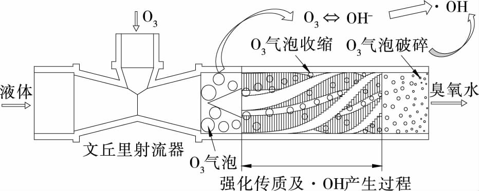 圖2 靜態混合器強化臭氧傳質及·OH產生原理