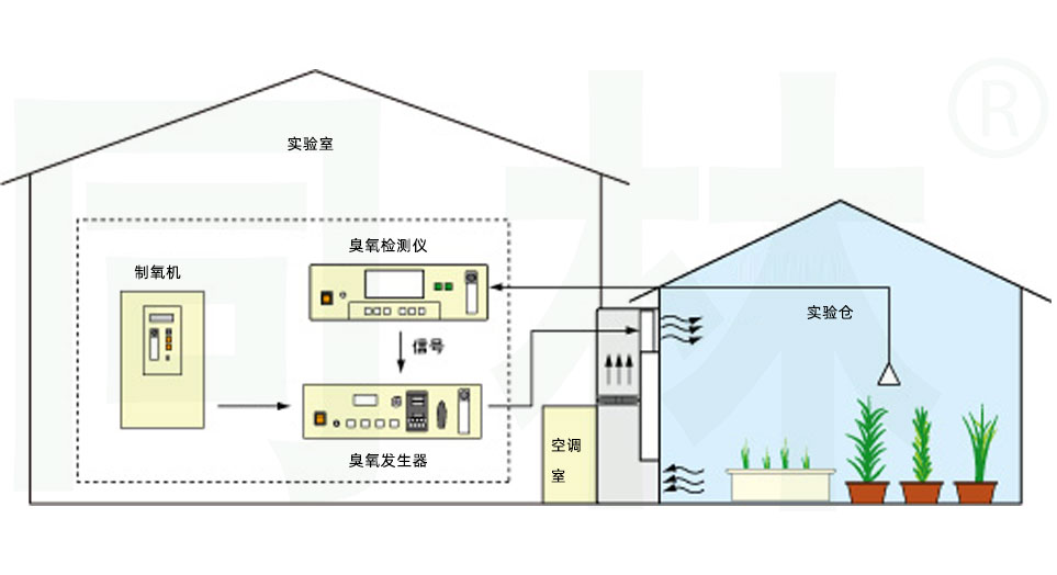 這是一個臭氧暴露系統的例子,用于測試臭氧對植物和其他植物的影響,使用現有的中型腔室(例如,玻璃腔室)。