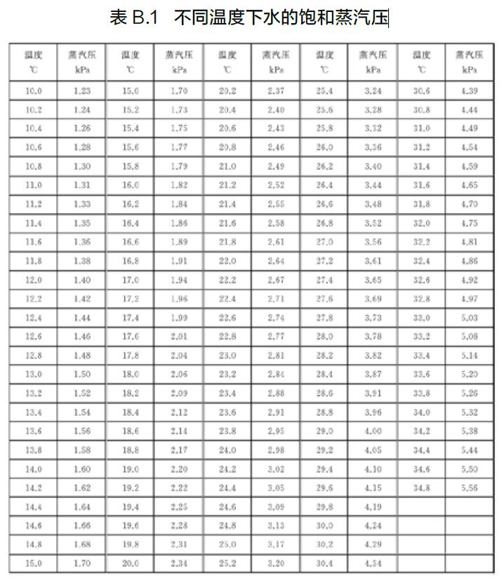 p v —— 飽和水蒸氣壓,單位為千帕(kPa),跟濕式流量計(jì)的溫度有關(guān),參見表B.1;